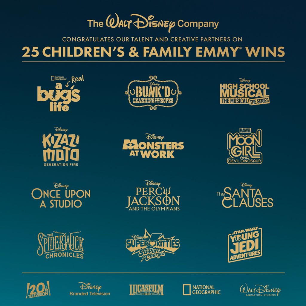 The 3rd Annual Children and Family Emmy Awards took place on Saturday, March 15, where The Walt Disney Company took home 25 wins across 20th Television, Disney Branded Television, Lucasfilm Ltd., National Geographic, Walt Disney Animation Studios, and platforms Disney+ and Hulu — with 18 of those wins for Disney Branded Television, the most for any industry group. With eight wins, Percy Jackson and the Olympians was the most-awarded series of the night.