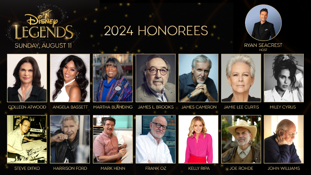 This year’s honorees include Colleen Atwood, Angela Bassett, Martha Blanding, James L. Brooks, James Cameron, Jamie Lee Curtis, Miley Cyrus, Steve Ditko, Harrison Ford, Mark Henn, Frank Oz, Kelly Ripa, Joe Rohde, and John Williams. Ryan Seacrest, the host of American Top 40, as well as American Idol and Dick Clark’s New Year’s Rockin’ Eve on ABC, will host the 2024 Disney Legends Awards Ceremony that will be filled with heartwarming tributes to each of the honorees, along with special guests, performances, and a legendary production like no other.