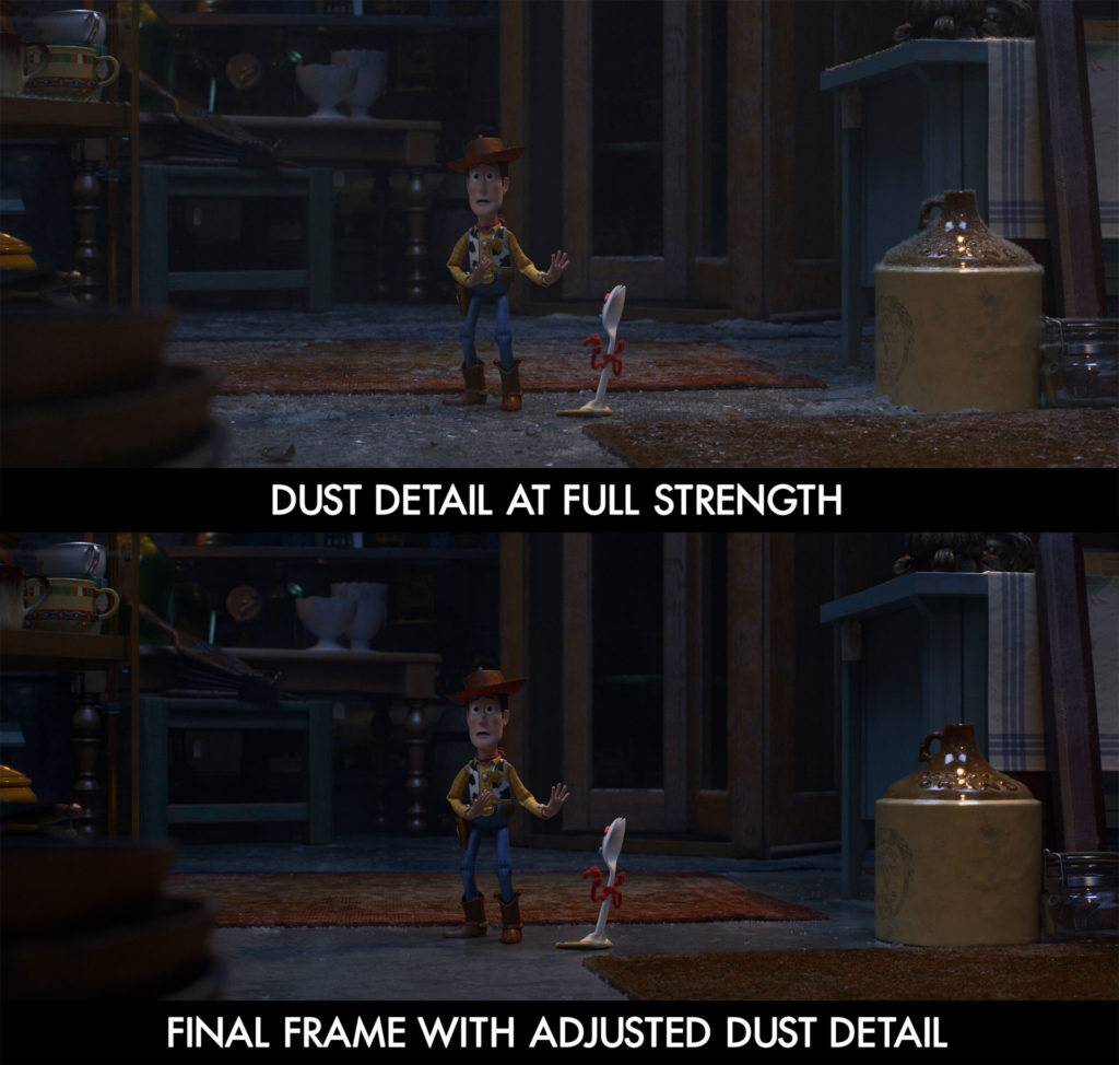 To bring some reality to the highly stylized Toy Story world, Pauley says, “We’ve added more complexity, more richness, to give you a sense of place and atmosphere.” To achieve that, Reeves explains, “We added dust particulate in the air… which led to visually pleasing bokeh effects.” Dust, in fact, is one of the elements the team is most proud to feature in Toy Story 4. “This was a detail that was initially saved for specific scenes,” Tu says, “but it was so successful in enriching every environment that we ended up putting it all over the entire antiques store.”