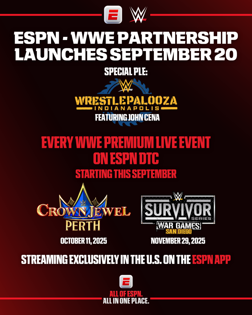 On September 20, ESPN becomes the exclusive U.S. domestic home of all WWE PLEs, with all PLEs available to ESPN DTC subscribers with the unlimited plan. Additional upcoming WWE PLEs this year include Crown Jewelon Saturday, October 11, and Survivor Serieson Saturday, November 29.